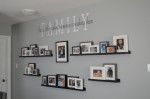 Once everything was up, Meg thought it needed one final touch. A vinyl wall decal… what else? Meg designed a few options with some different sayings and we finalized on “FAMILY, the best thing about memories is making them”. Very fitting for what this wall is. She researched a bunch of options for printing to find a good price and decided to use Switcharoo Graphics here in Waterloo. They (we had a family monogram made as well… see below) turned out great and were pretty easy to install.